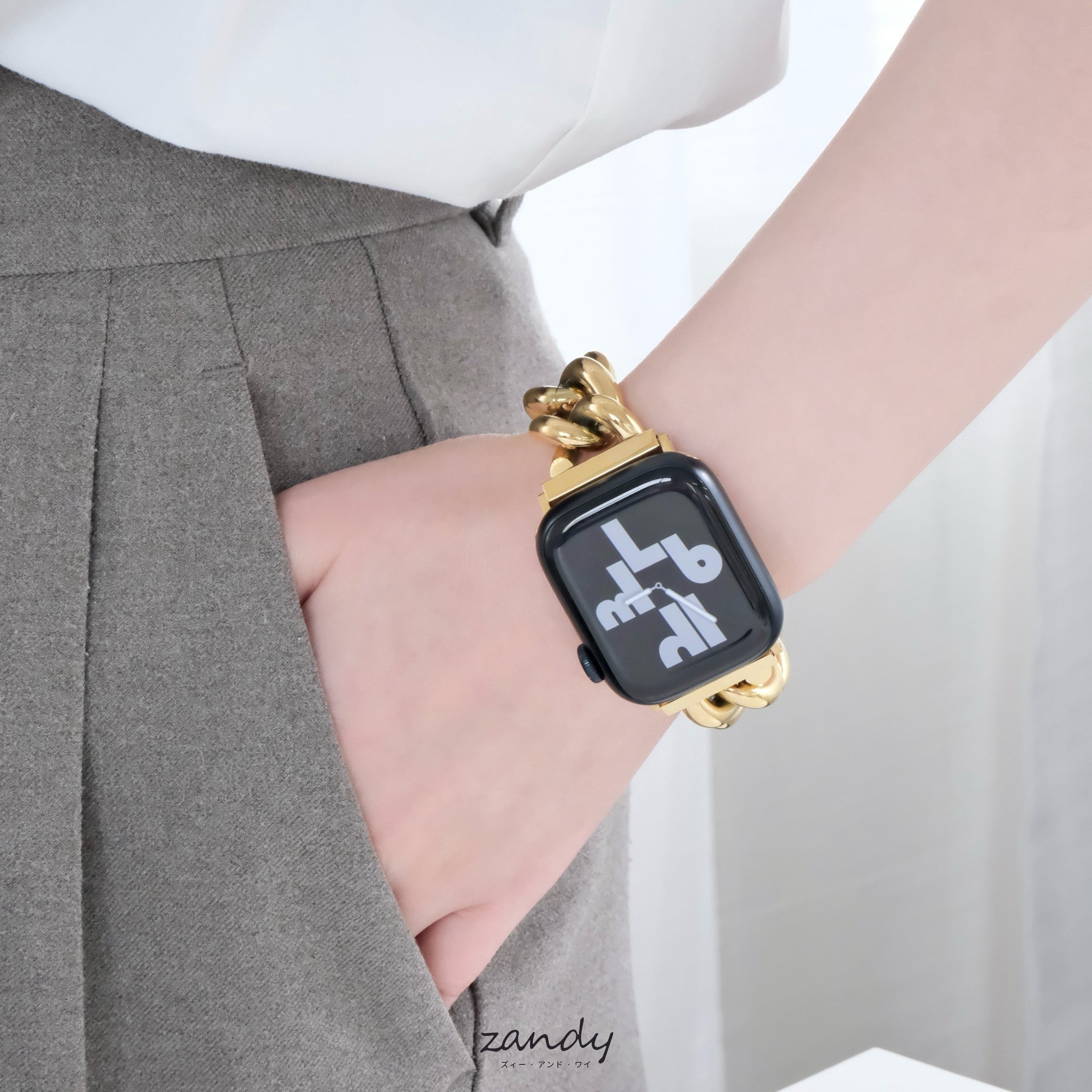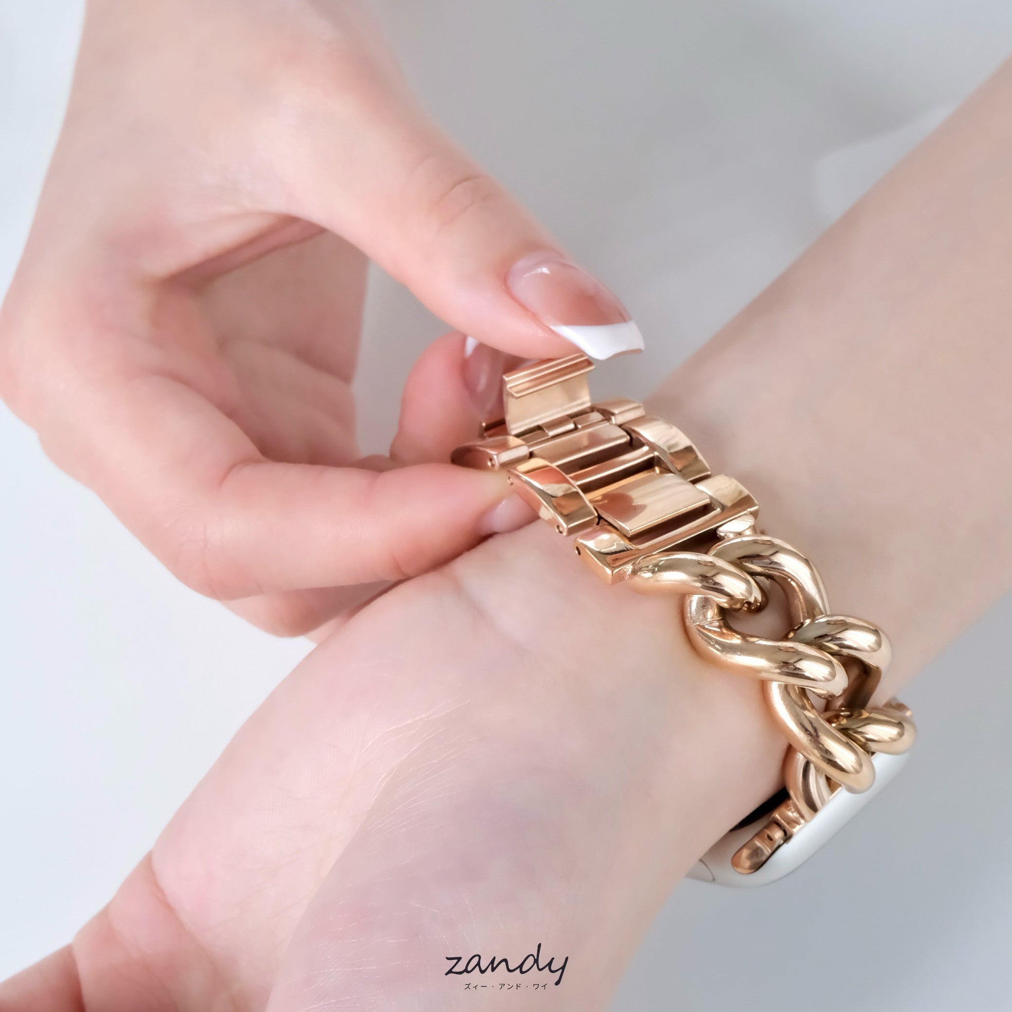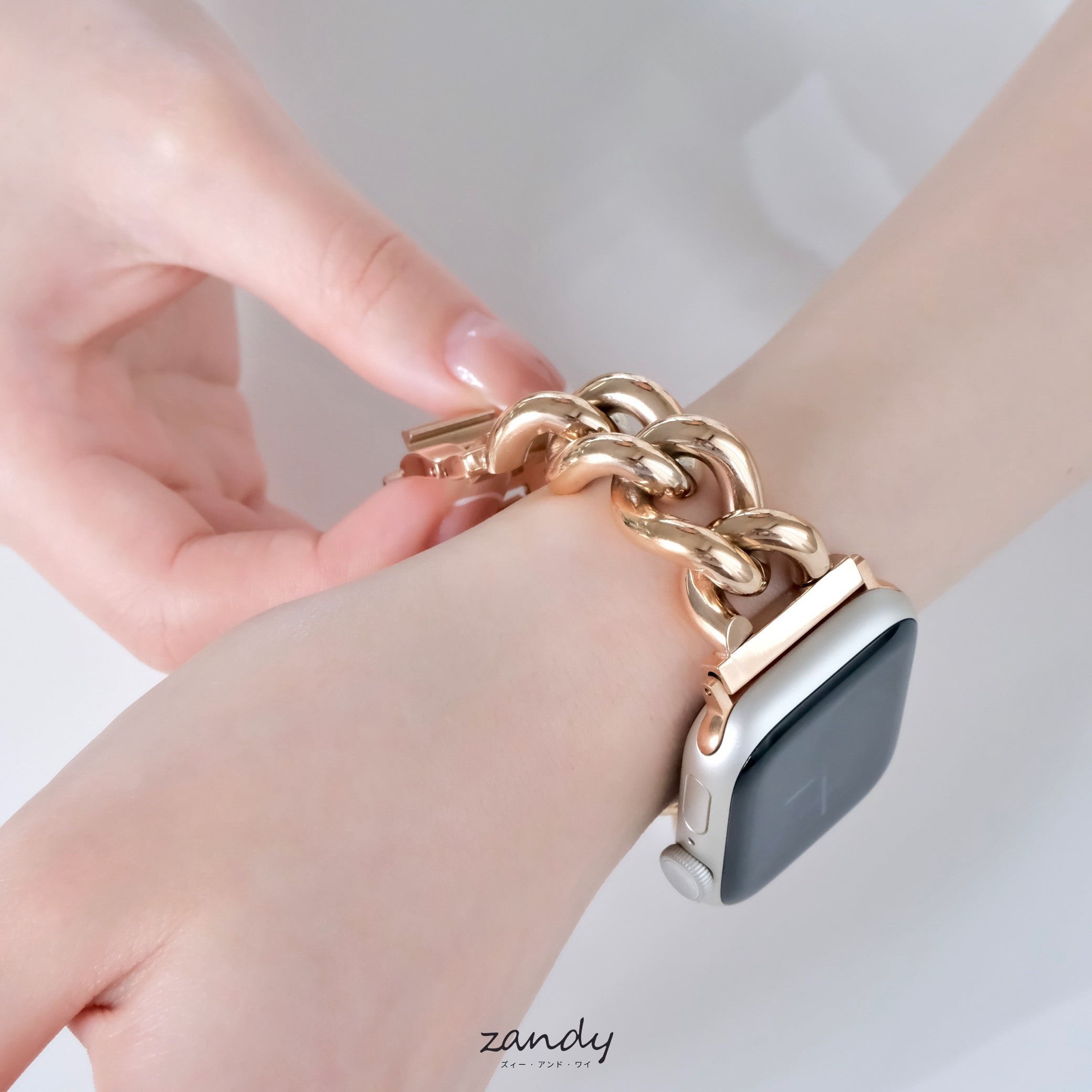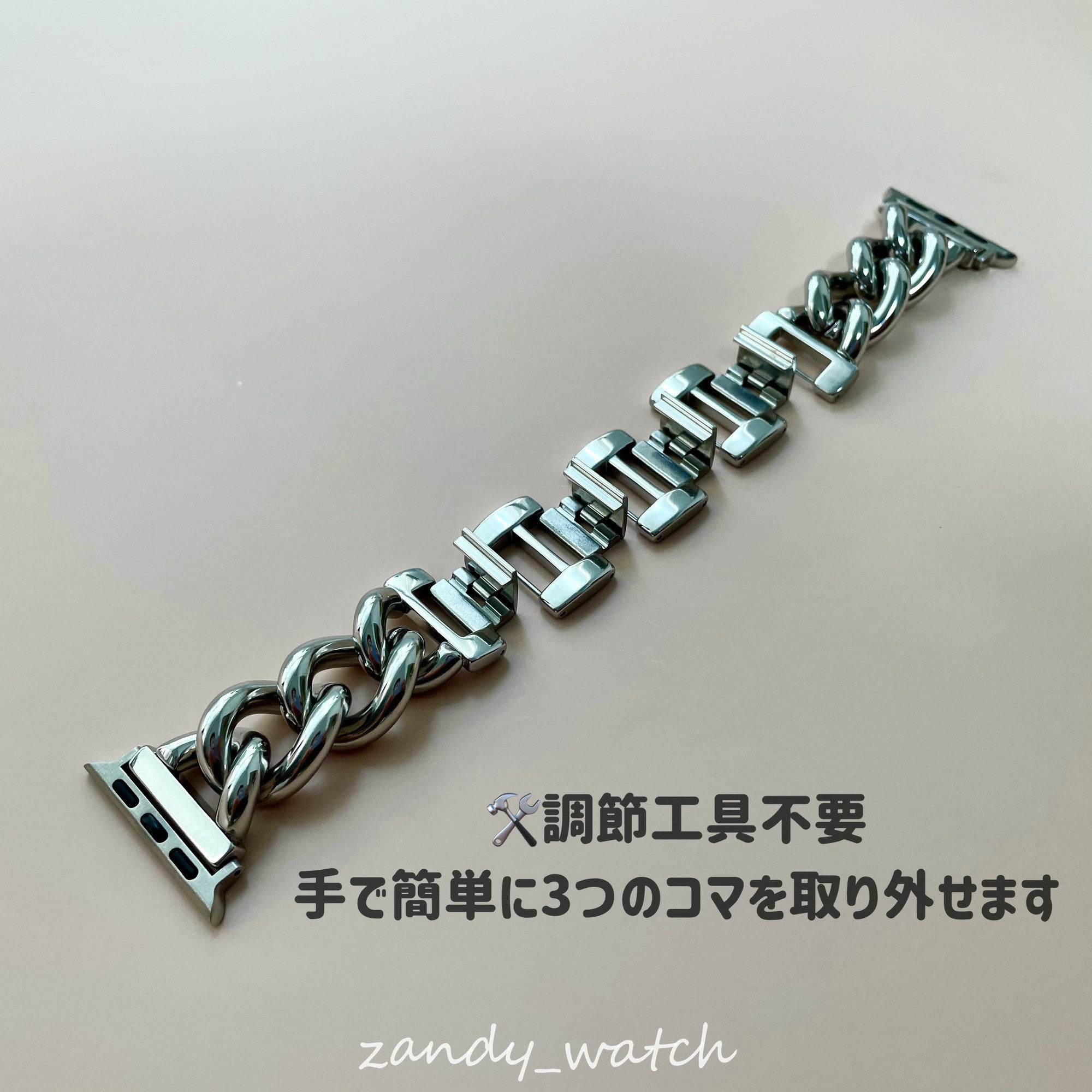 太めの鏡面チェーンバンドはブレスレット感覚で