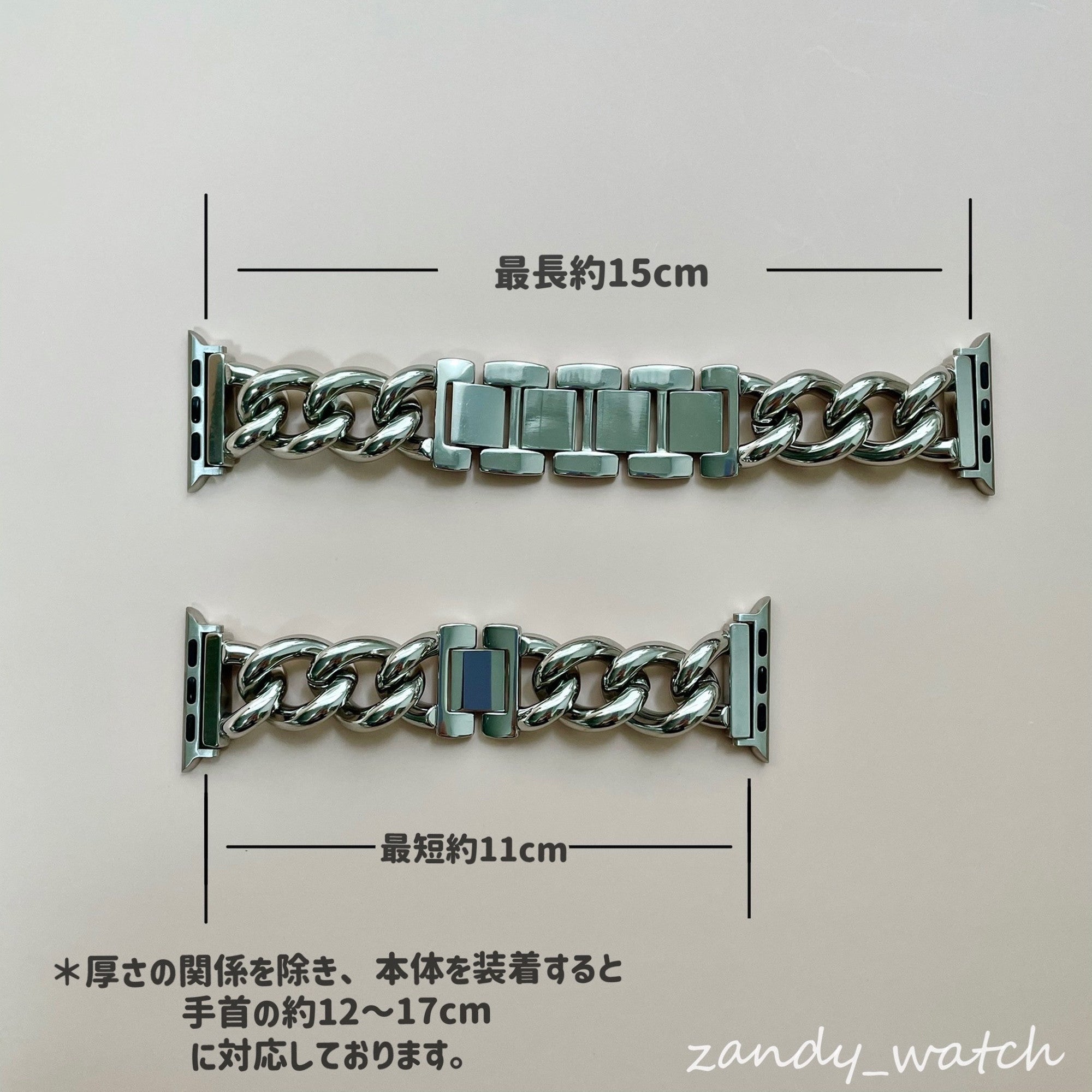 最短約110mm 手首の約120mm~170mmに対応しております。 |